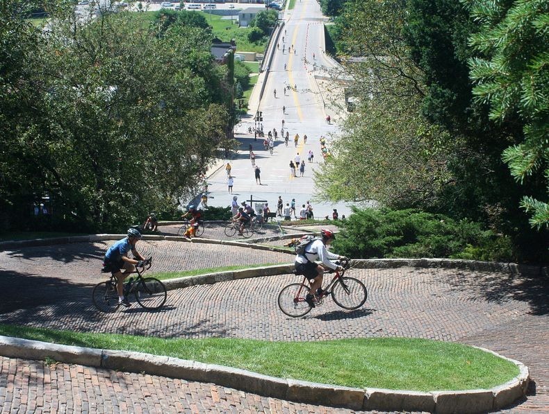 Snake Alley is paved with limestone and blueclay bricks. Bricks were laid at an angle to allow horses better footing as they descended. Unfortunately, riding horses back up the alley often resulted in a loss of control at the top; for this reason, even to this day, Snake Alley remains a one-way street, with all traffic heading downhill. However, once a year, a bike race is organized – the Snake Alley Criterium – where riders race uphill.